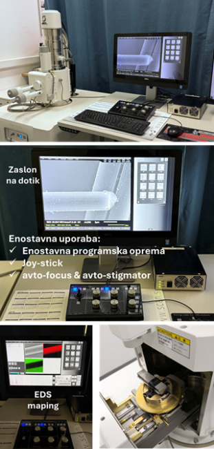 - Detektorji: SED, BED, EDS, EDS maping